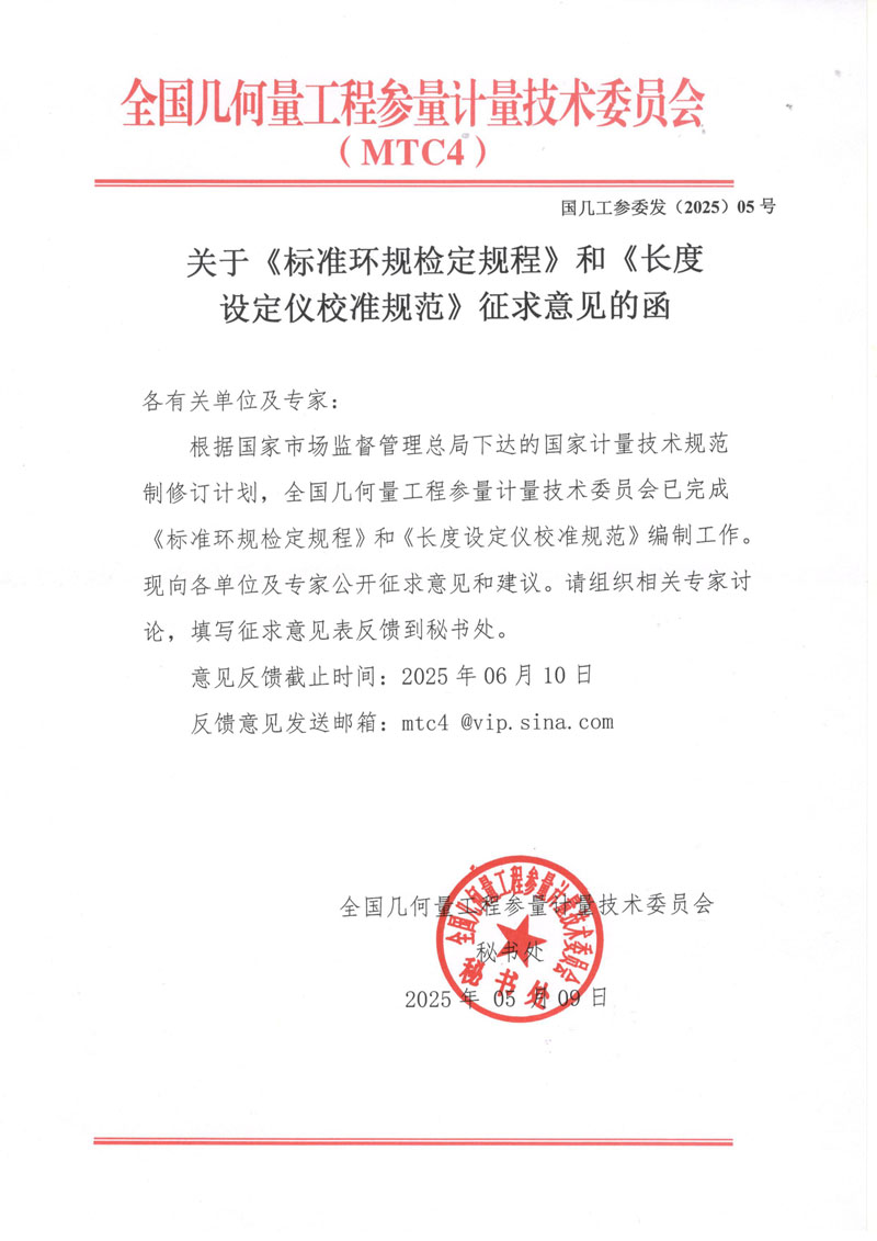 全国几何量工程参量计量技术委员会关于《标准环规检定规程》和《长度设定仪校准规范》征求意见的函