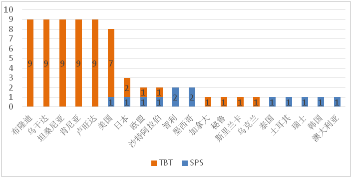 2023年6月21~23日,共有20个WTO成员通报了73项技术性贸易措施,其中60项为TBT措施、13项为SPS措施。通报情况为:布隆迪9项、乌干达9项、坦桑尼亚9项、肯尼亚9项、卢旺达9项、美国8项、日本3项、欧盟2项、沙特阿拉伯2项、智利2项、墨西哥2项、加拿大1项、秘鲁1项、斯里兰卡1项、乌克兰1项、泰国1项、土耳其1项、瑞士1项、韩国1项、澳大利亚1项。这些措施涉及轧制钢板和钢型材制成的门窗,挂锁和挂锁配件,工程用低碳钢丝,工业蜂蜜,皮肤用驱蚊剂,阻燃剂,仿制玩具枪,非静止轨道固定卫星,家用和商用热水器,吊扇,化学品,电动踏板车,干燥的植物产品,食品,饲料添加剂等。通报详情如图表所示。